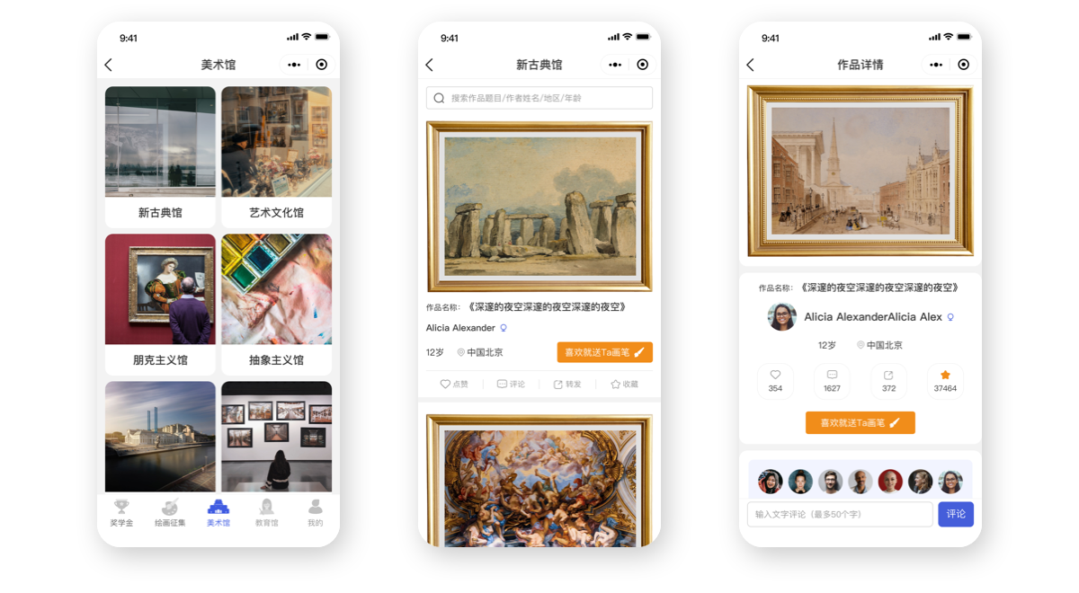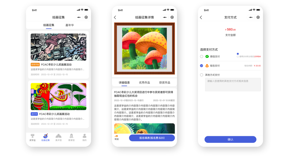 繪畫征集頁(yè)面主要是展示一些即將開始、正在進(jìn)行中以及進(jìn)行完成的一些繪畫征集活動(dòng)。