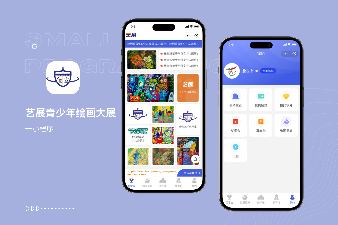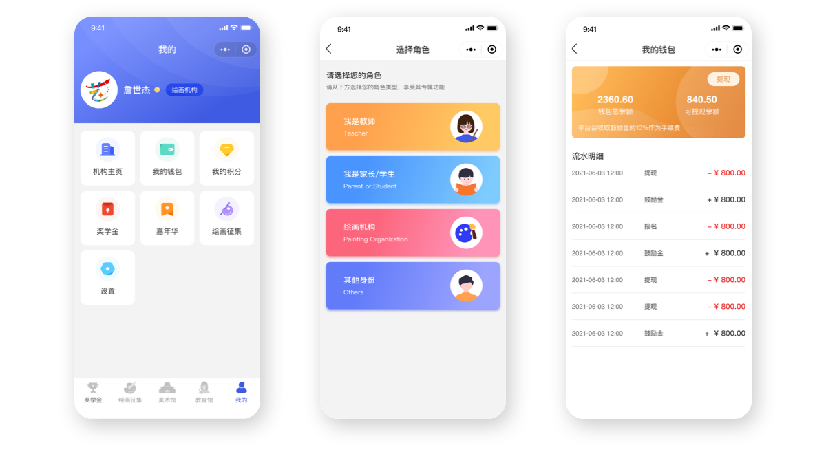 我的頁(yè)面又分為繪畫機(jī)構(gòu)的我的頁(yè)面、教師的我的頁(yè)面、其他角色的我的頁(yè)面,包括了錢包、積分、獎(jiǎng)學(xué)金、嘉年華、繪畫征集、設(shè)置等頁(yè)面。